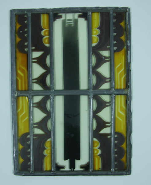 Glas-in-loodraam, met decoratie in de kleuren zwart, bruin en donkergeel.