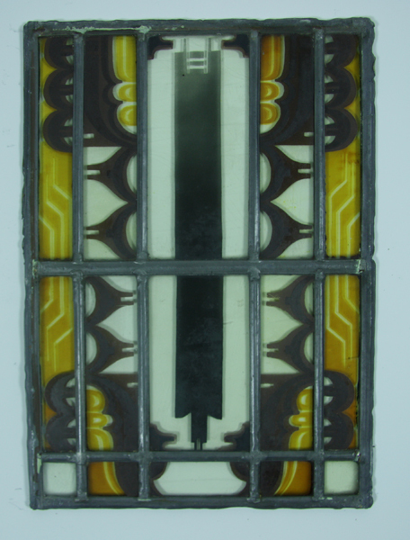 Glas-in-loodraam, met decoratie in de kleuren zwart, bruin en donkergeel.