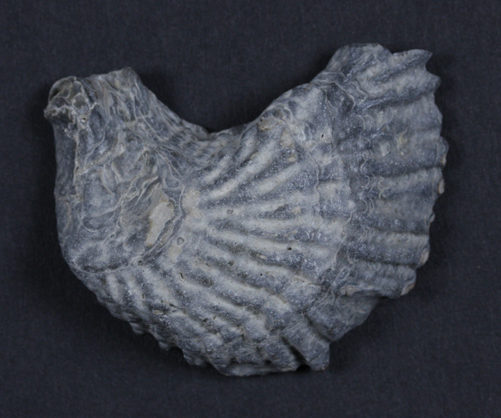 Druppelvormige platte schelp. Grijswit.