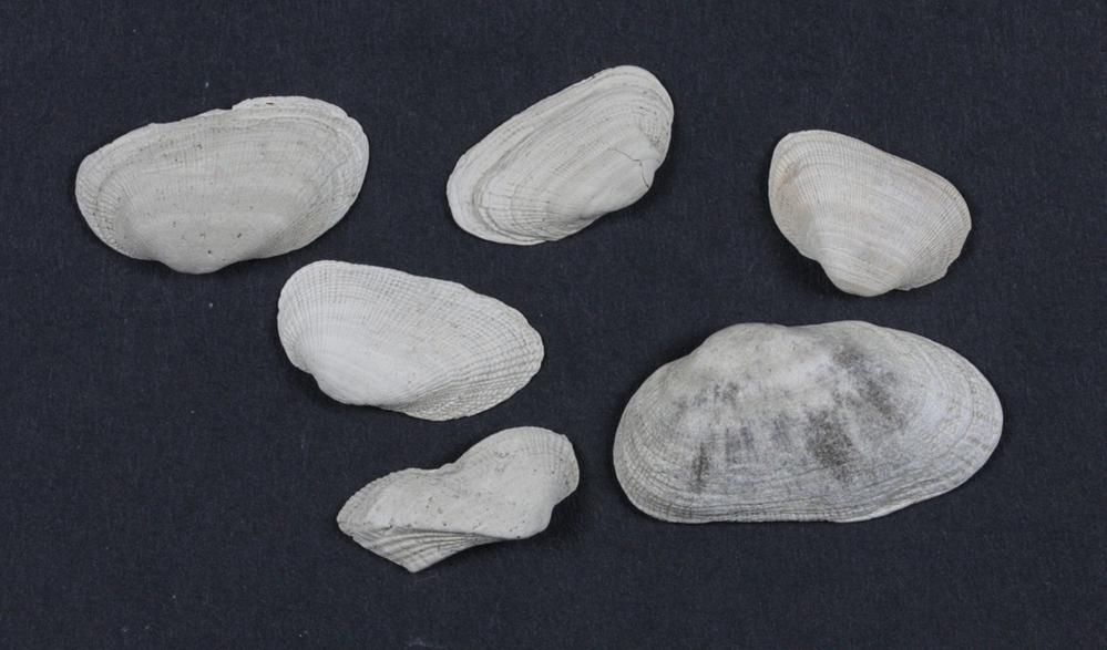 Zes witte schelpen.