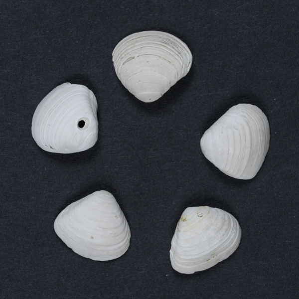 Vijf waaiervormige schelpen. Wit van kleur.