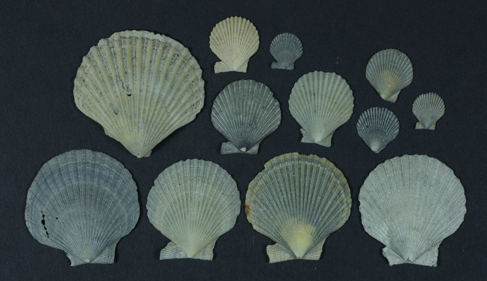 Twaalf waaiervormige schelpen. Kleur varierend van zandkleurig tot grijs. Verschillende afmetingen.
