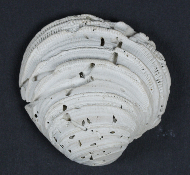 Witte waaiervormige schelp met duidelijke groeilijnen, parallel aan de onderrand.