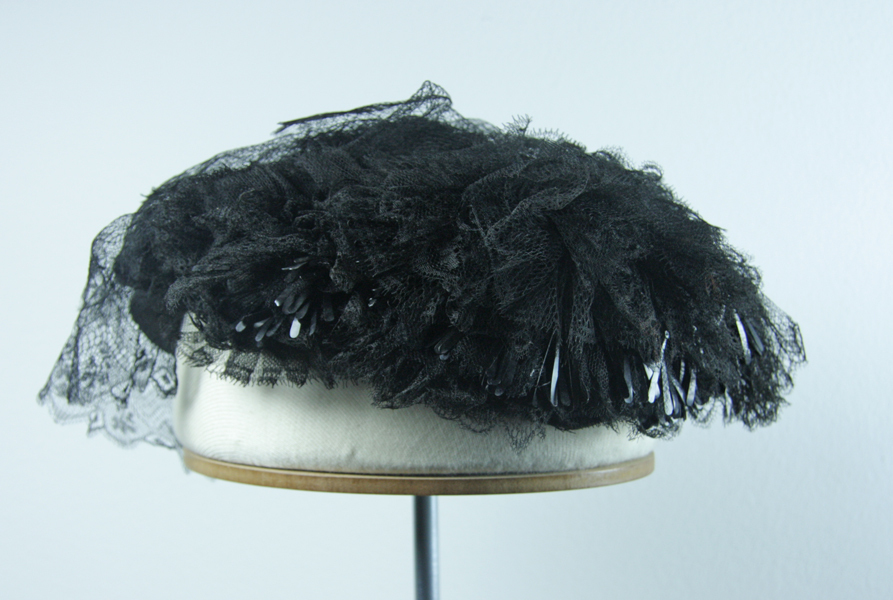 Zwart muts voorzien van tule en langwerpige pailletten.