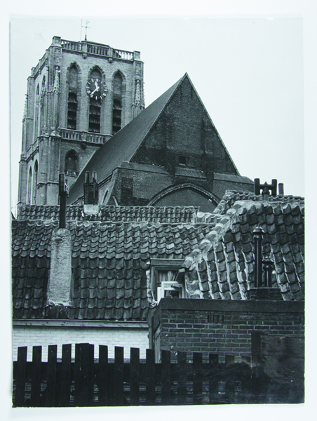 Foto op karton van de Catherijnekerk, vermoedelijk genomen vanaf het Wellerondom. Op de voorgrond daken van omliggende huizen en een schutting. Op de achterzijde zeven stukjes klitteband.