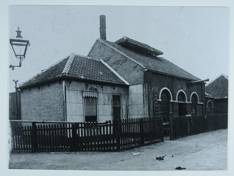 Foto op karton van de gasfabriek in de Dijkstraat, gezien vanaf de voorzijde. In het achterste gedeelte van het pand vier boogramen en een man die over het hek heen kijkt. Aan de achterzijde vijf stukjes klitteband.