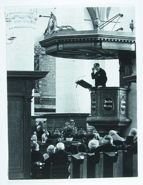Foto van dominee tijdens preek in de Catherijnekerk. Dominee staat op de preekstoel. In de banken mensen van de gemeente.
