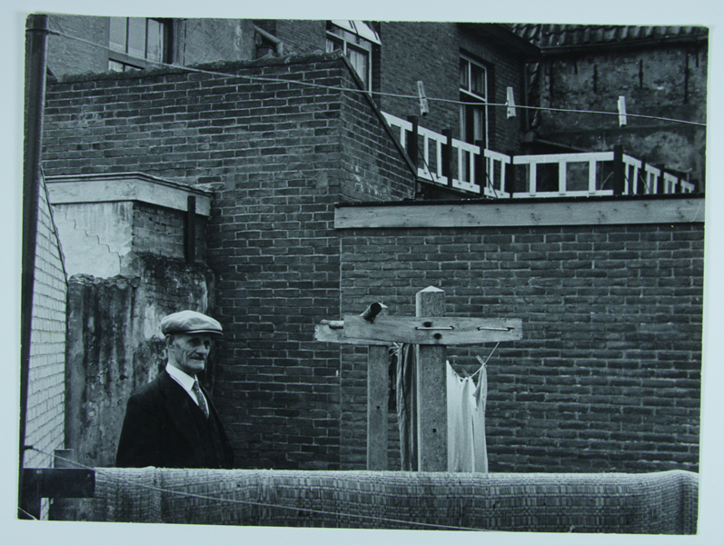 Portret van een man in zwart pak met pet, staande op een binnenplaats bij een waslijn. Op de voorgrond een tapijt over een hek. In de rechter bovenhoek een balkon.