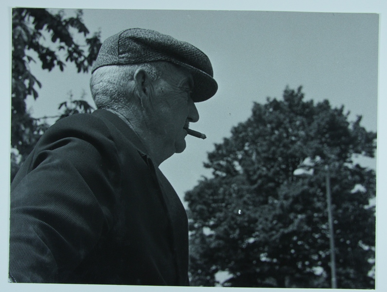 Portret van een man in pak met pet en sigaar in de mond. Op de achtergrond twee bomen.