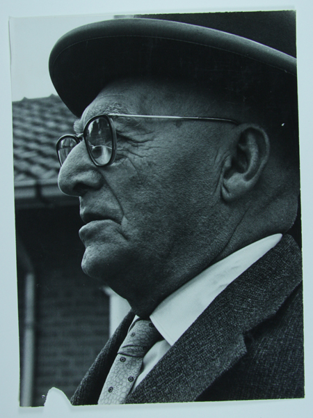 Portret van een man met bril, in pak met hoed en stropdas. op de achtergrond een huis of schuurtje.