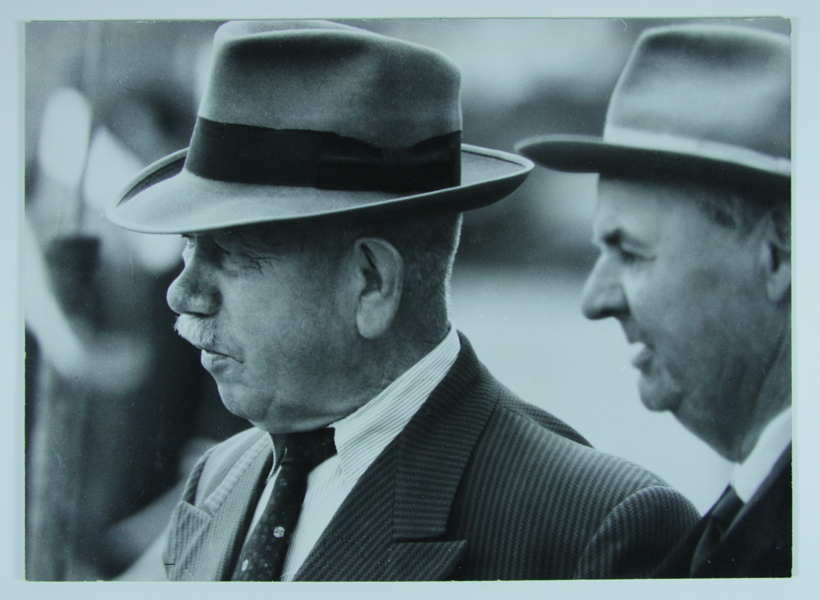 Portret van twee mannen in pak en met stropdas. De achtergrond is onscherp. De voorste man heeft een snorretje. Op de achterzijde vijf stukjes klitteband.