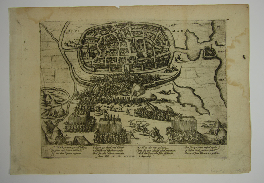 Ets met voorstelling van het Beleg van Alkmaar op 21 augustus 1573 tot 8 oktober 1573 . Op de prent een cartografische voorstelling van de stad Alkmaar. Op de voorstelling middenboven de stad Alkmaar. Middenonder het Spaanse regiment voor de vesting van Alkmaar. Onder de voorstelling opschriften in het Duits.