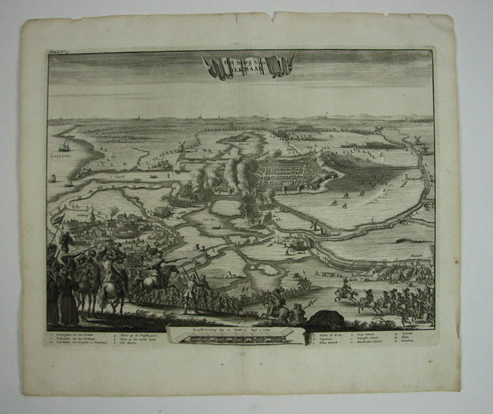 Prent met voorstelling van het beleg van Alkmaar in 1573. Prent met cartografische voorstelling van de stad en omgeving van Alkmaar. Op de voorgrond het Spaanse leger die de stad naderen en omsingelen. Vuurgevechten rondom de stad.