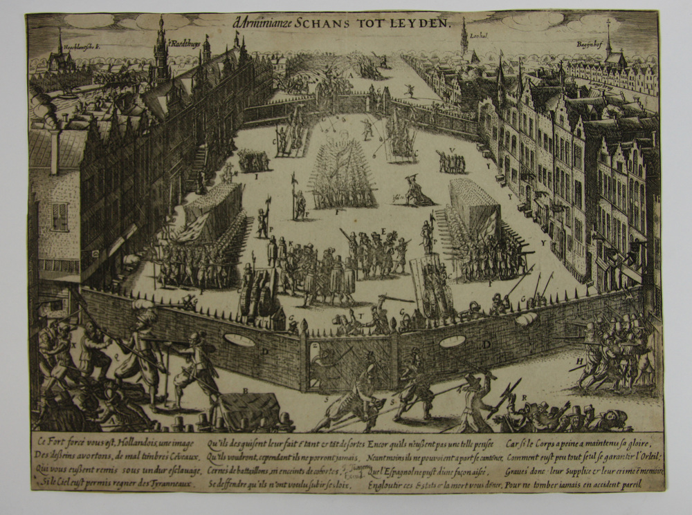 Prent met voorstelling van de arminiaanse schans te Leiden. Op de voorgrond de getande omheining in de Breestraat met links het stadhuis. In de Breestraat en op de voorgrond de verschillende partijen arminianen en gomaristen tegenover elkaar. Op de achtergrond de o.a. de Hooglandse kerk en begijnhof. Onder de voorstelling een zestienregelig Frans gedicht.