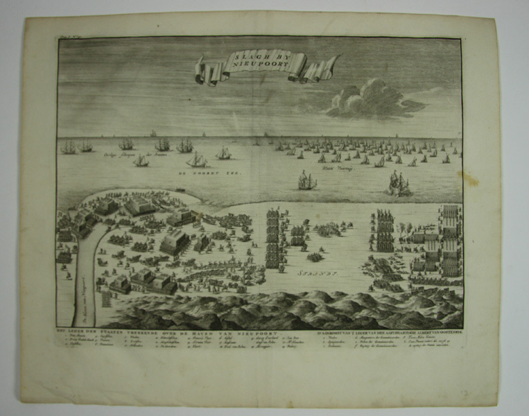 Prent met voorstelling van de slag bij Nieuwpoort op 2 juli 1600. Op de voorgrond achter de duinen het Spaanse leger in gevecht met het Staatse leger (Republiek) op het strand nabij Nieuwpoort. Links de haven van Nieuwpoort. Op de achtergrond de Noordzee met diverse schepen. Titel van prent middenboven in banderol. Opschrift met beschrijving ...