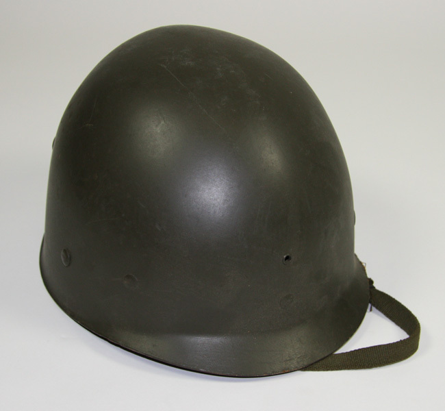 Helm, groen, bolvormig met klep voorzien koord.