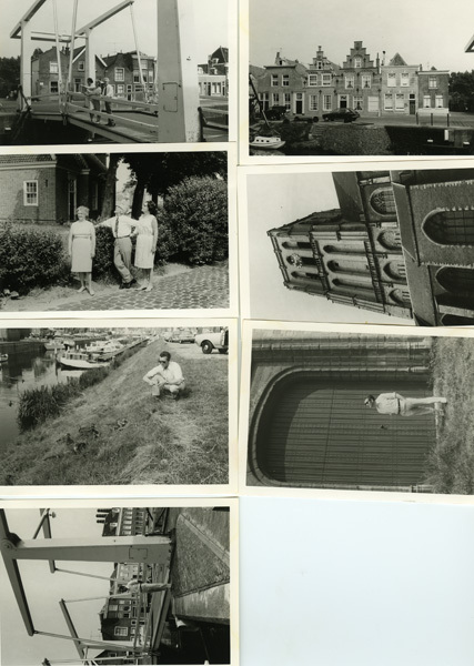Foto, acht stuks met stadsgezichten van Brielle. Eerste foto is groepsportret op de 'Rode Brug' met op de achtergrond de gevels aan het Slagveld. Tweede foto is gezicht op huizen aan de Batterijweg. Derde foto is groepsportret op de Catharijnehof. Vierde foto Catharijnekerk. Vijfde foto is man bij eendjes nabij water aan het Scharloo. Zesde ...