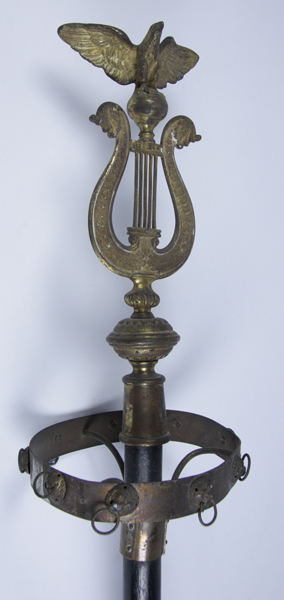 Houten stok, zwart geverfd, met metalen decoratie in de vorm van een vogel met uitgespreide vleugels op een stileerde harp bovenaan. Hieronder een prijzenring met rondom leeuwenkoppen.