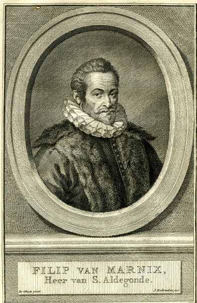 Kopergravure met portret van Filip van Marnix , heer van S. Aldegonde (1540-1598). Lichaam en hoofd naar links gedraaid. Kijkt beschouwer en face aan. Man heeft golvend haar met een hoge inham, heeft een sik, snor en baard. De man draagt een mantel, voorzien van knopen, en is afgezet met bont. Daarboven draagt de man ...