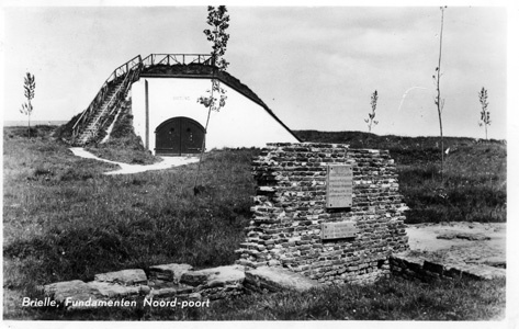 Ansichtkaart met op de voorgrond de fundamenten van de Noordpoort te Brielle. Op de achtergrond links Bastion IX. Ansichtkaart met wit kaderrand. Ansichtkaart is verstuurd, is voorzien van een postzegel van 4 cent en voorzien van een poststempel uit 1960.