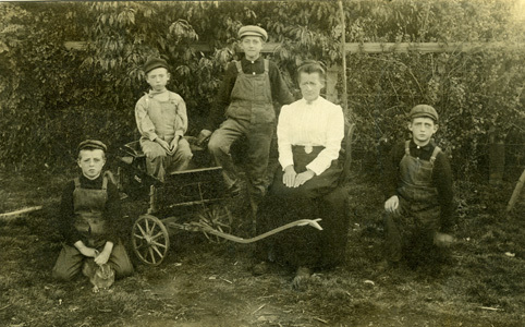 Ansichtkaart met groepsfoto in een tuin te Brielle. In het midden zit een vrouw met witte blouse en zwarte rok op een stoel. Links van haar een jongen met pet in tuinbroek. Rechts van haar drie jongens eveneens met pet en in tuinbroek. Een jongen zit op een kar. Ansichtkaart is beschreven maar niet voorzien ...