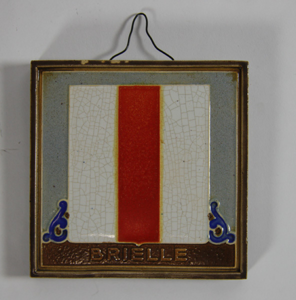 Tegel zijnde een gedenktegel met het wapen van Brielle. Onder wapen opschrift. Aan weerzijden van het wapen twee blauw gekleurde voluten. Voorzien van ophanghaak.