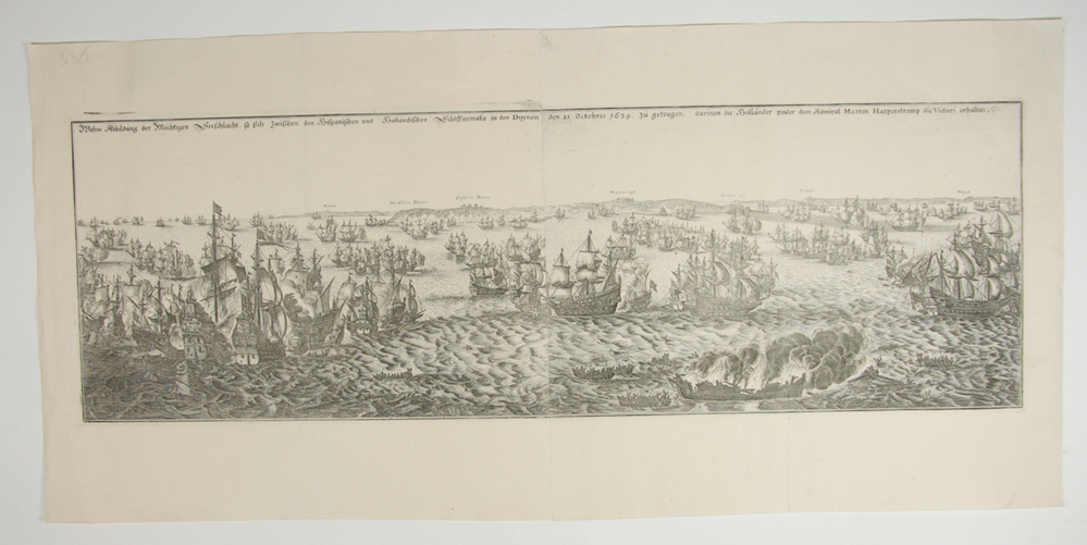 Prent met afbeelding van de Zeeslag bij Duins. Bestaat uit twee delen. In het midden een plakrand.