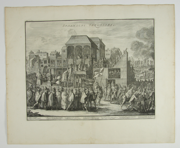 Prent, bestaand uit twee delen. In het midden een plakrand. Afbeelding van Processie van ca. dertig door de Spaanse Inquisitie ter dood veroordeelde protestanten naar een plaats buiten de stad waar ze op de brandstapel verbrand worden. In het midden een gebouw met hoogwaardigheidsbekleders, hiernaast een houten tribune waarop de ketters veroordeeld worden. De veroordeelden ...