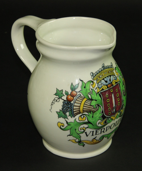 Kan met daarop het wapen van Vierpolders. Wapen Vierpolders omringd met florale motieven. Opschrift achterkant kan: '14 mei 1957'. Opschrift onder kan.