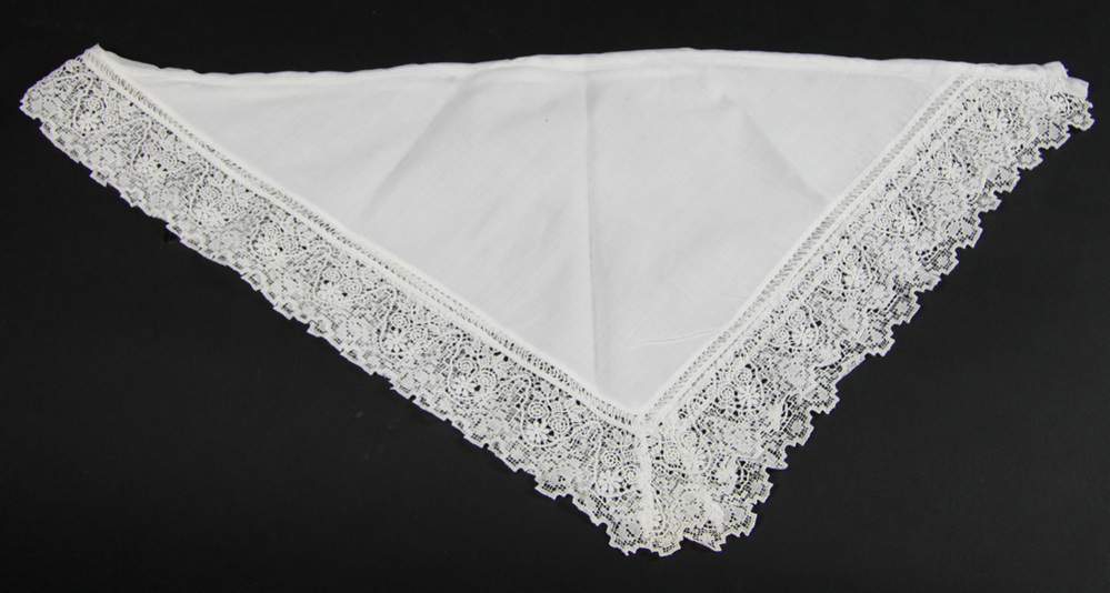 Kleedje, katoen met een gehaakte rand van kant voorzien van florale motieven.