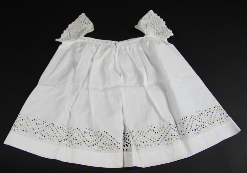 Wit katoenen hemd, mouwen en hals afgewerkt met broderie. Onderkant hemd eveneens voorzien van een strook broderie. Sluiting aan bovenkant dmv een knoopje.