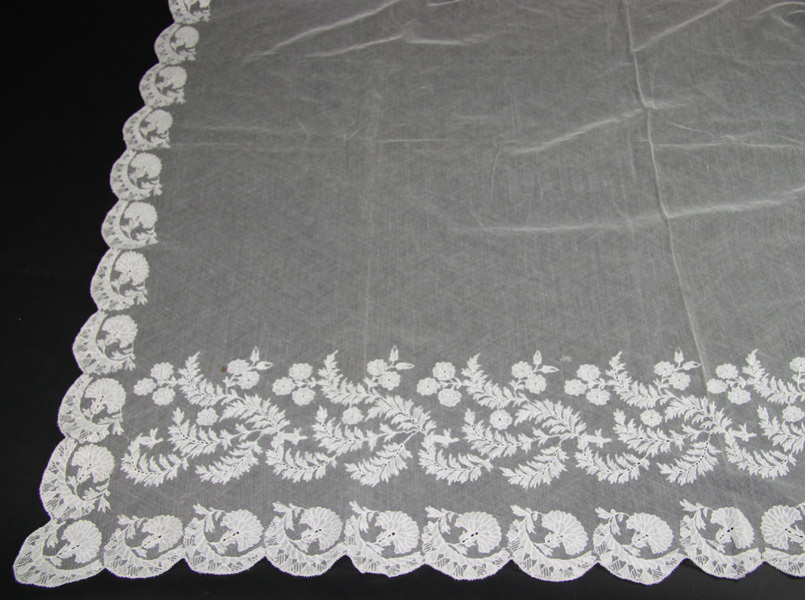 Vitrage, rechthoekig met geschulpte rand van kant voorzien van florale motieven. Onderkant vitrage, boven geschulpte rand, voorzien van een strook geborduurde versieringen van florale motieven.
