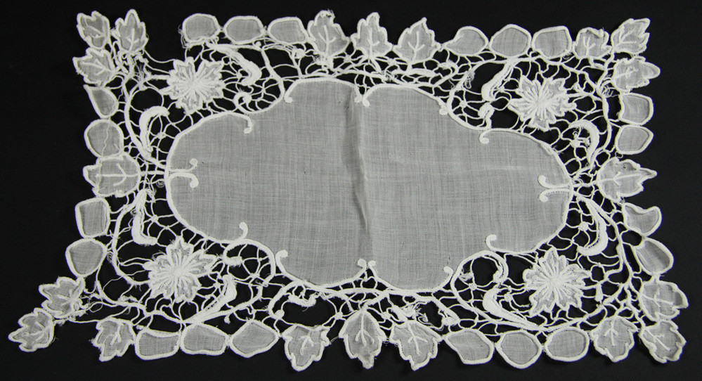 Gehaakt kleedje, wit, rechthoekig en voorzien van florale motieven.