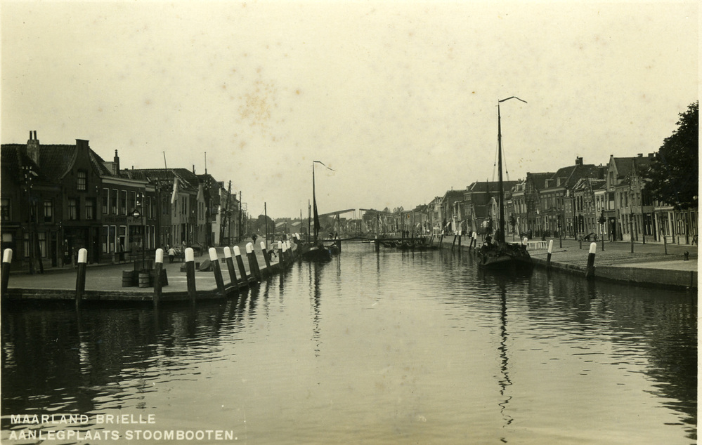 Ansichtkaart of foto, zwart/wit met gezicht op de haven (Maarland) van Brielle, met aanlegplaats voor stoomboten.