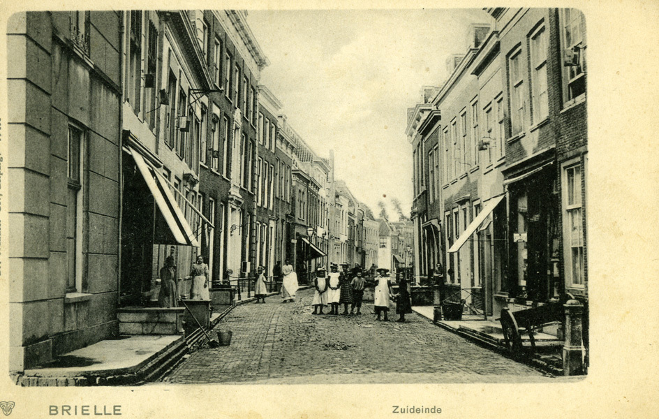 Ansichtkaart, zwart/wit met gezicht op Zuideinde te Brielle. Op de achtergrond staan een aantal personen op straat en nabij de voordeur geposeerd.