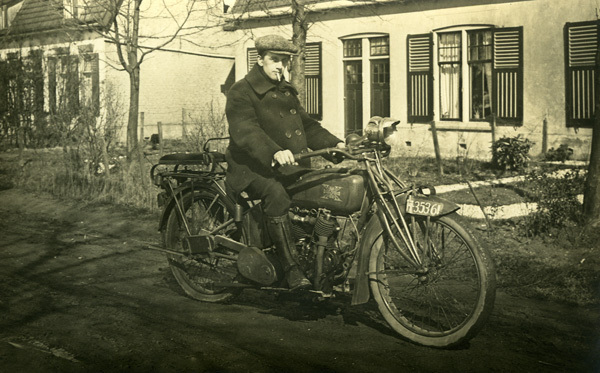 Ansichtkaart, zwart/wit, met een man op een motor. Op de achtergrond enkele huizen met een witte gevel voorzien van luiken.