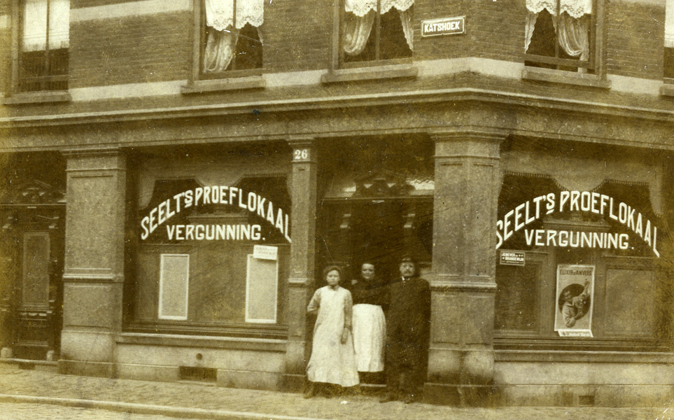 Ansichtkaart , zwart/wit, met gezicht op Seelt's Proeflokaal op Katshoek te Brielle. In de deuropening staan 2 vrouwen en een man.