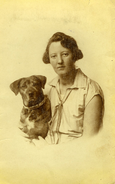 Foto op ansichtkaart, zwart/wit waarop een vrouw, Daniëlle Moerman' met halflang haar met rechts van haar een hond.
