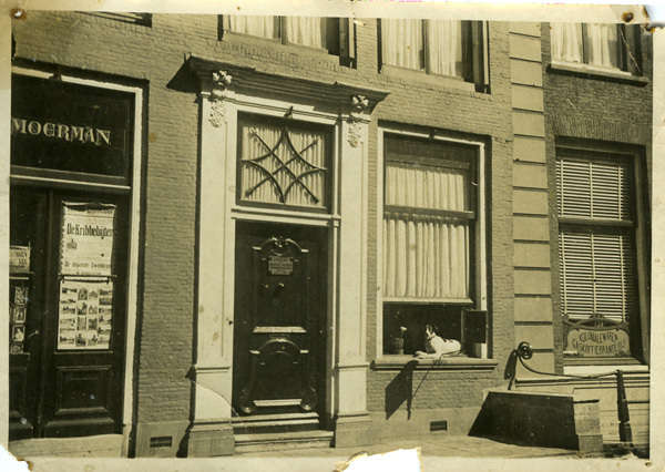 Foto, zwart/wit, met de voorgevel van uitgeverij Moerman te Brielle. Foto heeft een witte kader.