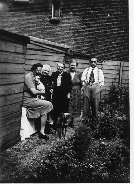 Foto, zwart/wit, met groepsportret bestaande uit 4 vrouwen een man en twee honden in een tuin. Foto heeft een wit, gekartelde rand.