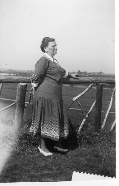 Foto, zwart/wit met foto van vrouw in landschap. Foto heeft een witte kader.