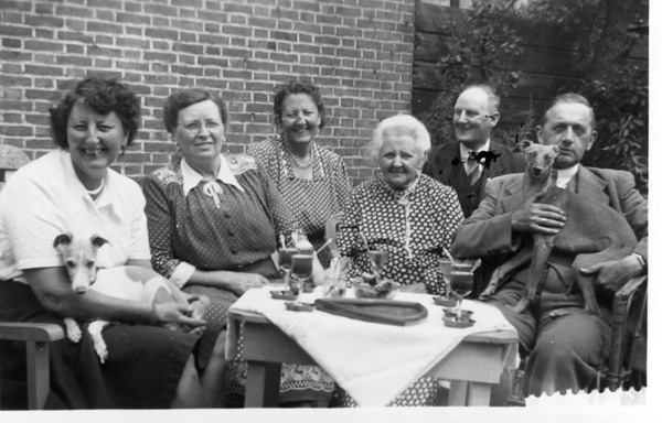 Foto, zwart/wit, met groepsfoto bestaande uit vier vrouwen, twee mannen en twee honden. Allen zittend rondom een tafel in een tuin. Op de tafel staan glazen met drinken. Foto heeft een witte kader.
