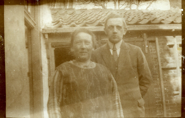 Foto, zwart/wit, met portret van een vrouw en man achter een huis.