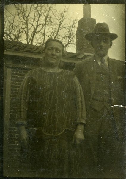 Foto, zwart/wit, met portret van een vrouw en man achter een huis.