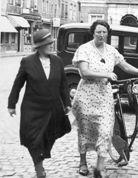 Foto, zwart/wit, met groepsportret van twee vrouwen op de Markt te Brielle. Vrouw rechts heeft een fiets in haar hand. Op de achtergrond een auto en de voorgevel van de Hoofdwacht.