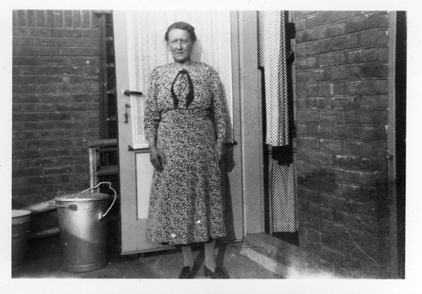 Foto, zwart/wit, met portret van een vrouw staande bij een achterdeur van een huis. Foto heeft een wit, gekartelde kader.
