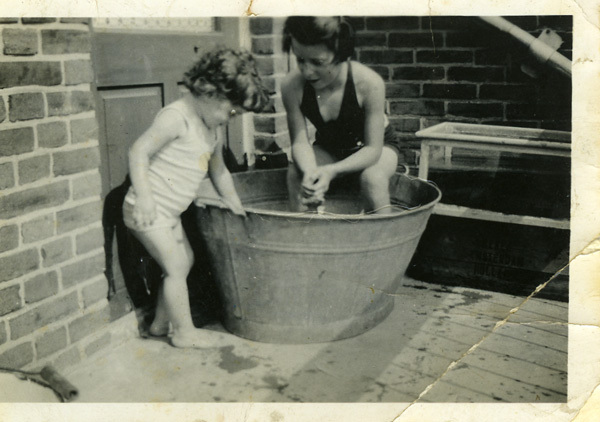 Foto, zwart/wit met een vrouw met kind bij een tobbe. Vrouw zit op rand van de tobbe met voeten in het water. Kind staat naast de tobbe. Foto buiten naast een huis gemaakt. Foto heeft een wit, gekartelde rand.