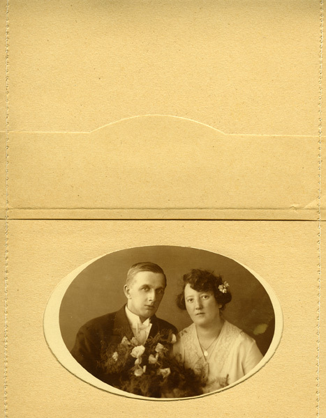 Ansichtkaart of foto, zwart/wit , zijnde een ovale trouwfoto in mapje. Links de man in pak met witte blouse en das, rechts de vrouw in een witte trouwjurk met een corsage in haar haar. Tussen de man en vrouw het trouwboeket.