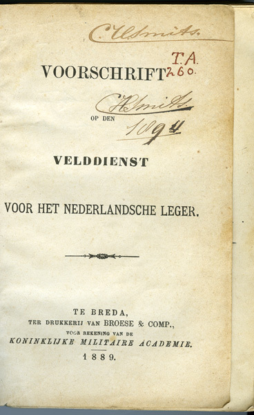 Klein boekje, getiteld: 'Voorschrift op den Velddienst voor het Nederlandsche leger. Gebruikt door C. Smits.