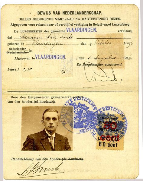 Legitimatiebewijs,groen van Adrianus Arie Smits voor Nederland, Begië en/of Luxemburg.